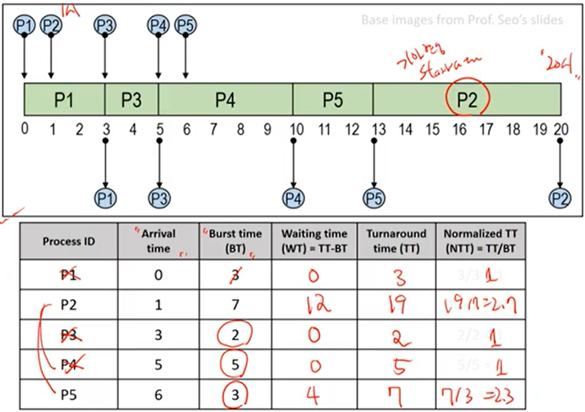 - Starvation (무한대기) 현상이 발생하여, Burst time이 긴 프로세스는 자원을 할당받지 못할 수도 있다.