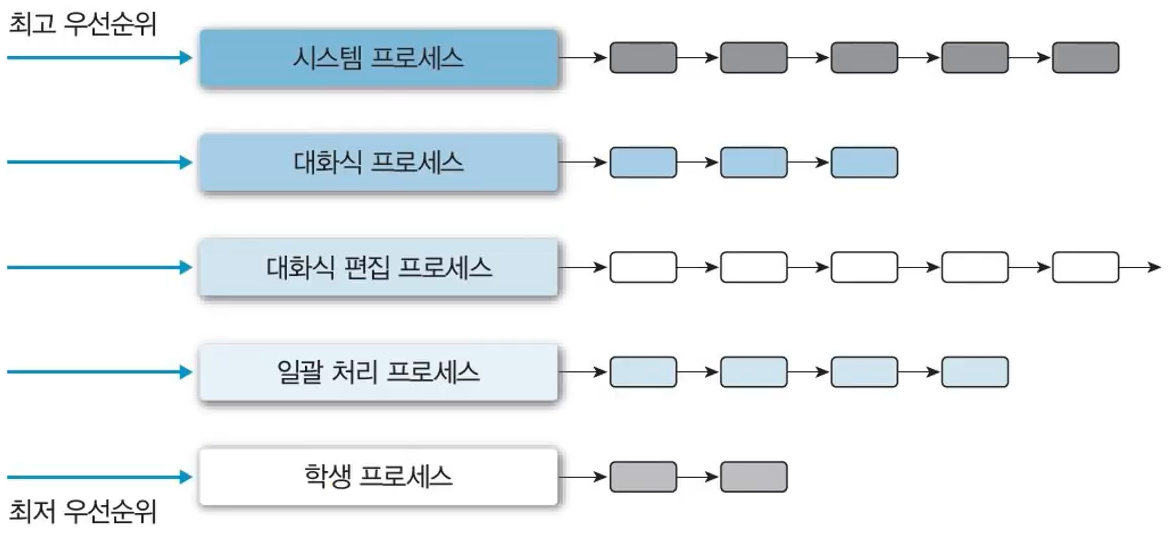 - 작업 또는 우선순위 별 별도의 ready queue를 가진다.