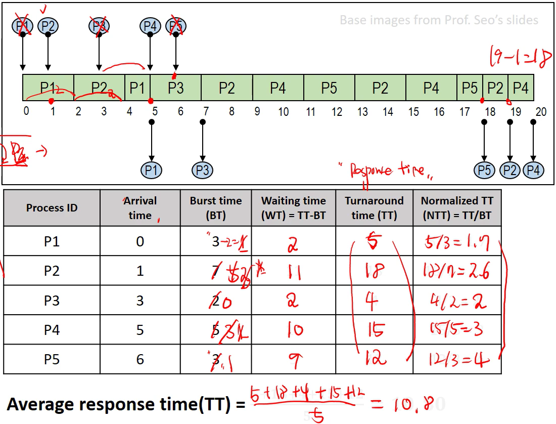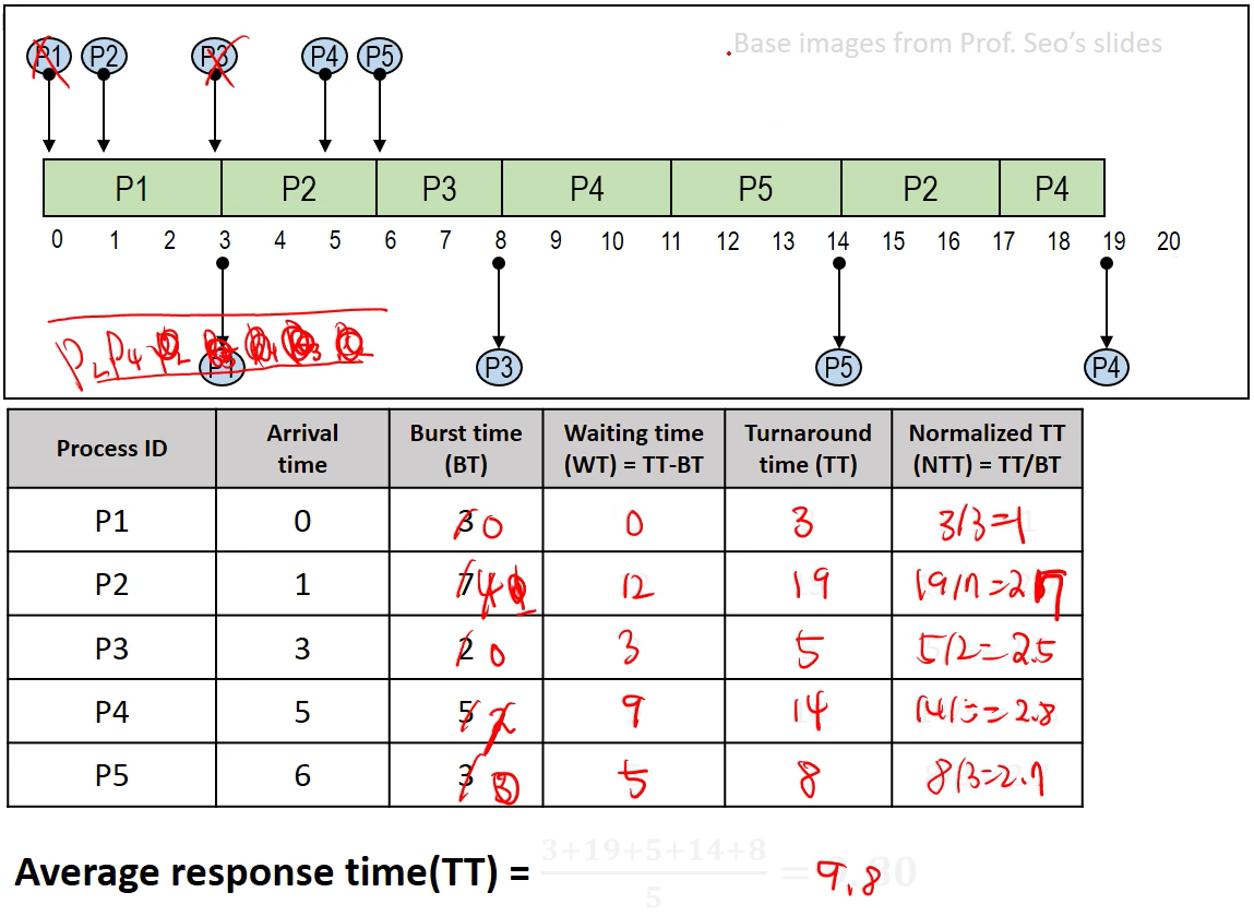 - Turnaround time (TT) : 프로세스가 들어와서 종료될 때까지의 총 시간. 여기서는 response time으로 볼 수 있다.