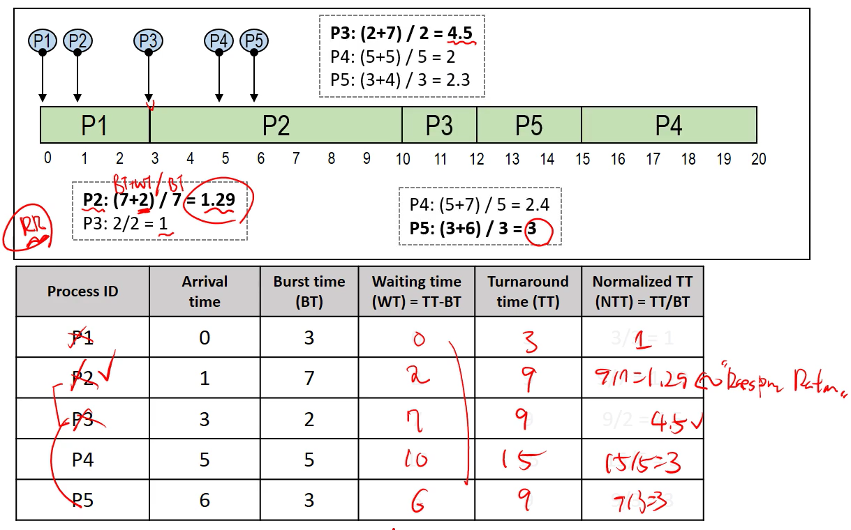 - Response ratio = ( WT + BT ) / BT 가 높은 프로세스를 우선으로 한다.