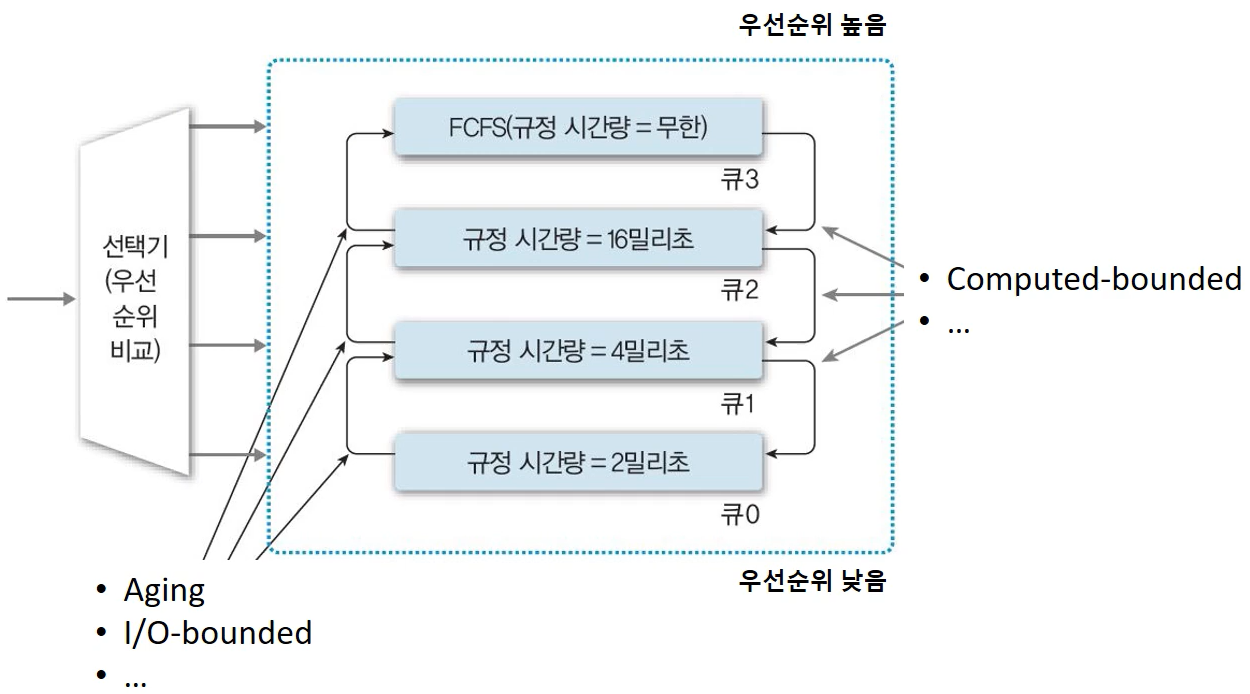 - Aging 기법을 사용하여 대기 시간이 지정된 시간을 초과한 프로세스들은 상위 queue로 이동시킨다.