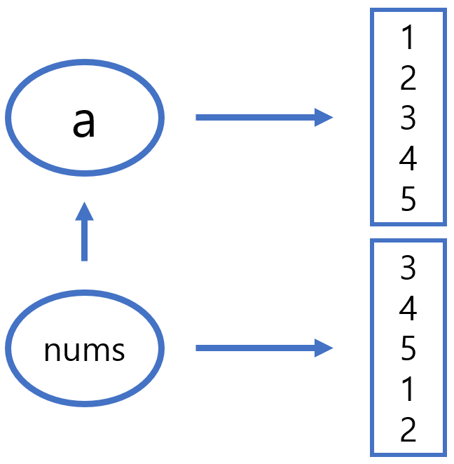 - [:]를 붙이면, nums가 a가 가리키는 요소들에 접근하여 직접적으로 값을 바꾼다.