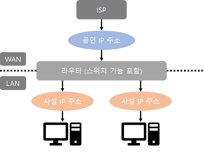 IP 주소가 부족해지면서 인터넷에 직접 연결되는 컴퓨터나 라우터에 공인 IP 주소를 할당하고, 회사나 가정의 랜의 컴퓨터에는 사설 IP 주소를 할당한다.