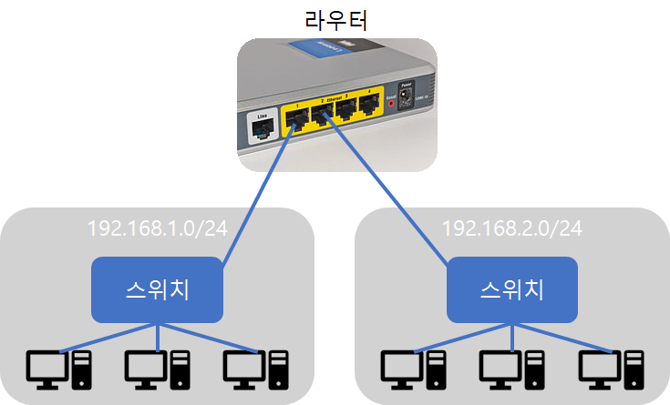 만약 라우터 대신 스위치(or 허브)를 사용하면 연결된 모든 장비는 같은 네트워크에 속하게 된다.