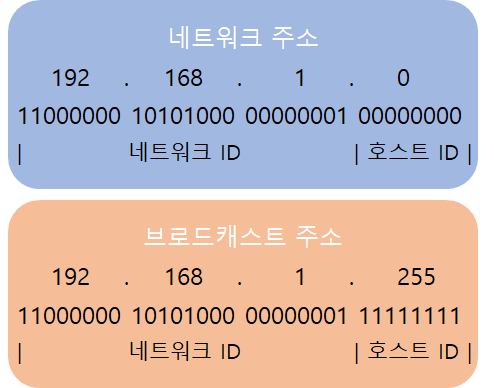 브로드캐스트 주소는 호스트 ID가 10진수로는 255, 2진수로는 11111111인 주소이다.