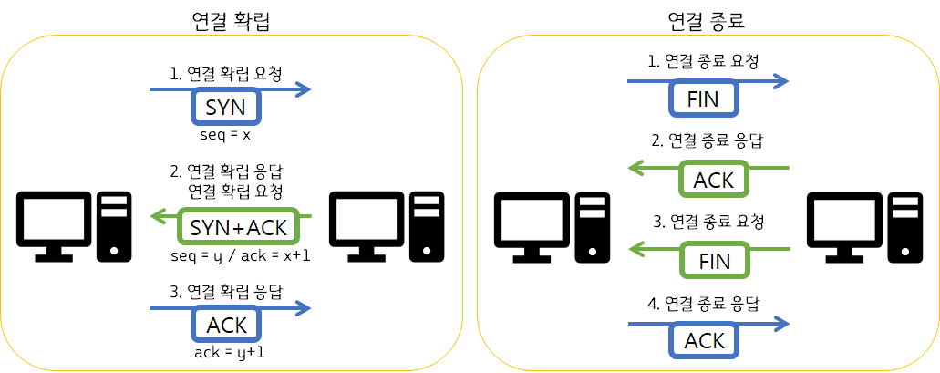 연결을 위해서 연결 요청 SYN, 확인 응답 ACK가 사용된다.