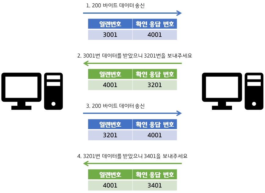 예를 들어, 일련번호가 3001번인 200바이트 데이터를 받으면, 수신 측은 그 다음 데이터인 3201 데이터를 확인 응답 번호로 보낸다.