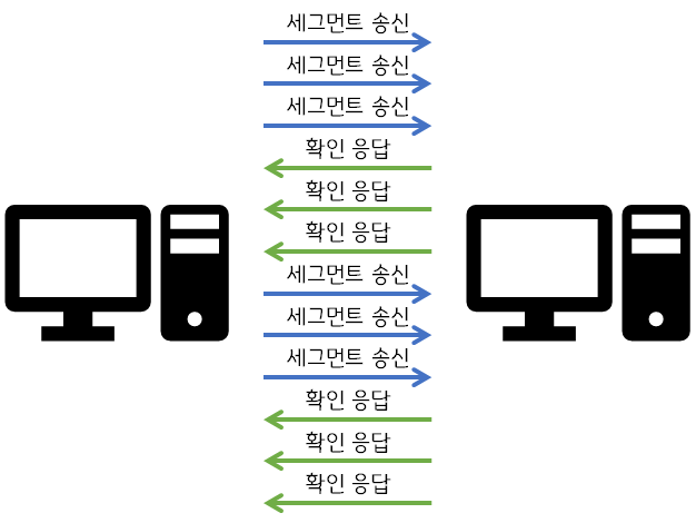 위에서는 세그먼트(데이터)를 하나 보낼 때마다 매번 확인 응답을 보내기 때문에 비효율적이다.