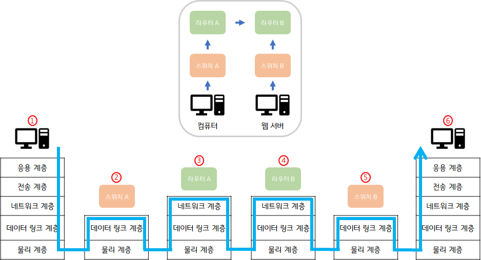 2대의 컴퓨터가 있고 아래의 경로를 거쳐 데이터가 전송된다.