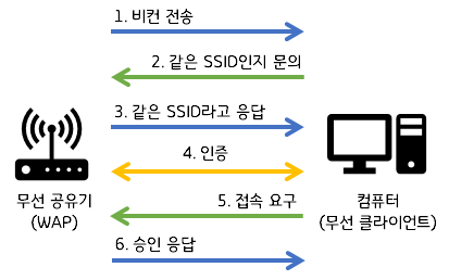 - 무선 클라이언트는 이 신호를 받아서 자신의 SSID와 같은지 WAP에 문의한다.