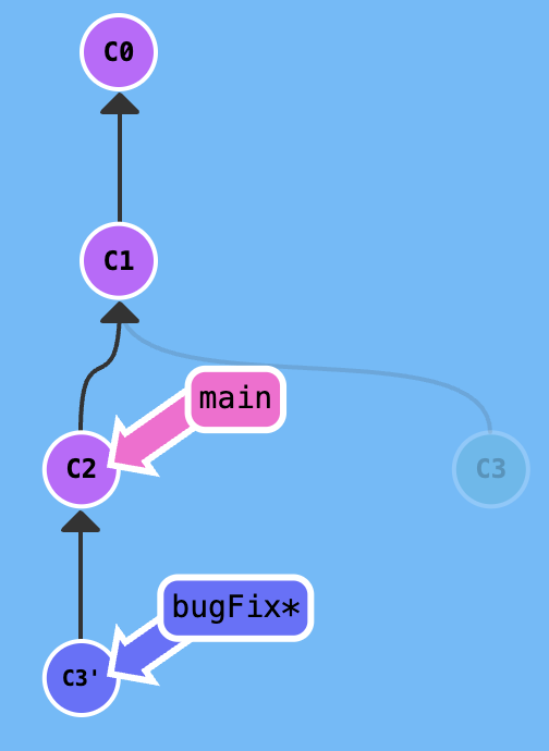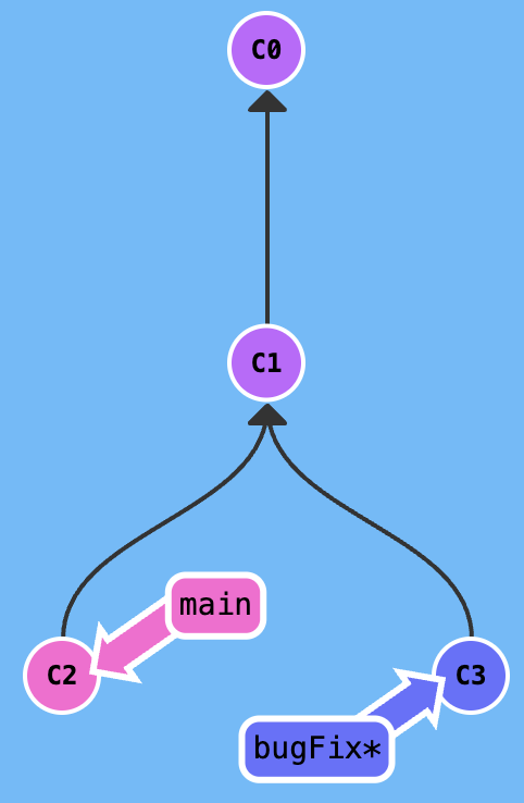 - 왼쪽처럼 c2, c3 커밋을 각각 가리키는 bugFix, main 브랜치가 있다고 하자.