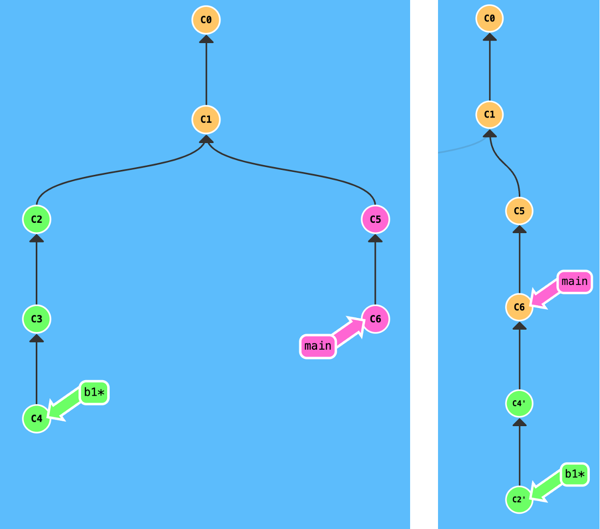 -> c1 부터 b1 까지의 커밋 c2, c3, c4 를 main 뒤에 붙이자.