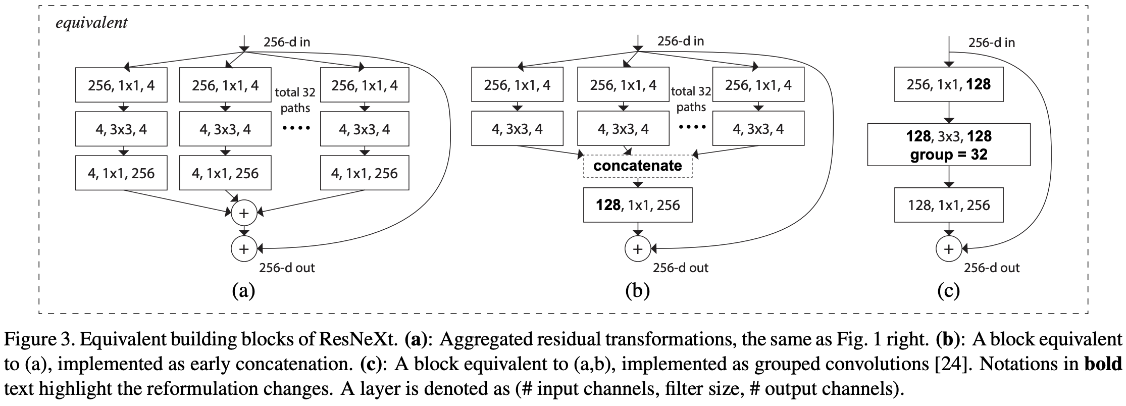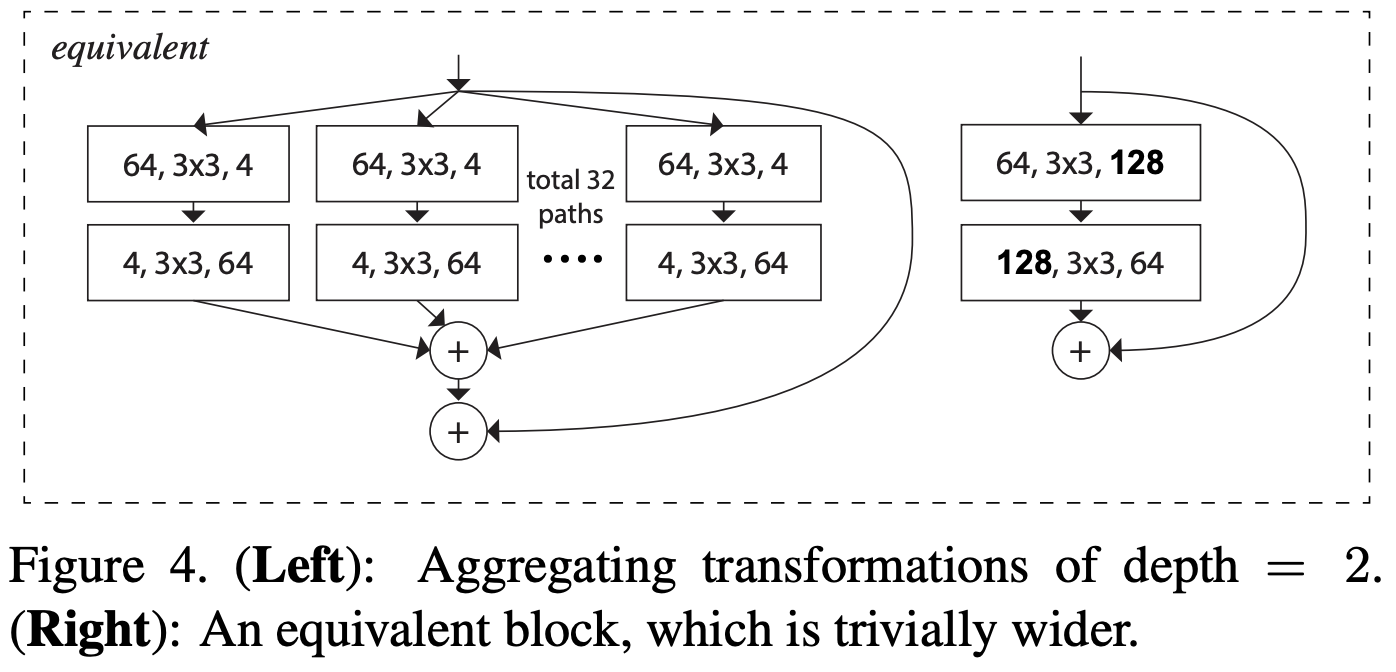 (b) 채널 수가 4개인 32개의 path 가 병렬로 실행되고, 1x1 conv 로 채널 수를 다시 늘리지 않고 concatenation 한 후 1x1 conv를 수행한다.