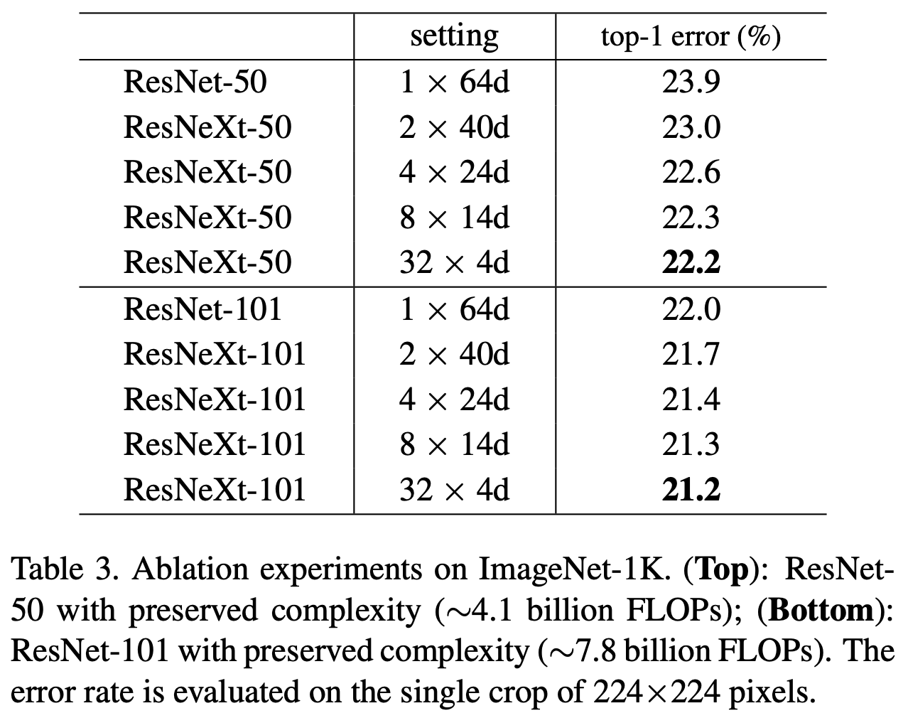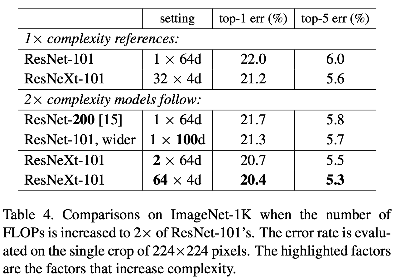 하지만 아래 표를 보면, ResNet을 깊고 넓게 만드는 것보다 cardinality 를 높이는 것이 error 를 더 낮추고 있다.