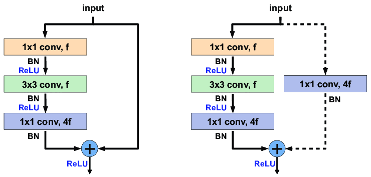 convolution block : 입력 x를 출력에 더해주기 전 1x1 conv를 한 block