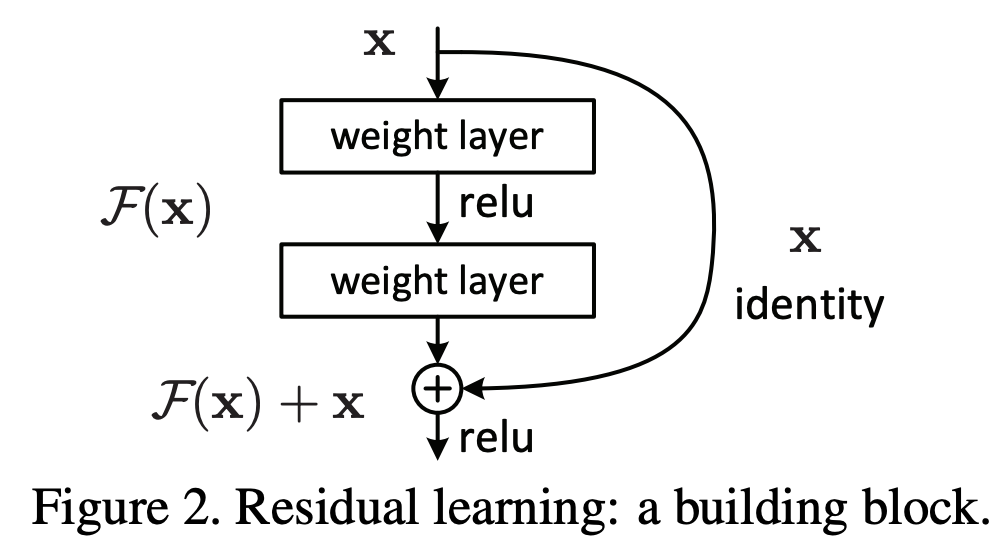 입력 x를 출력에 더해서 H(x)=F(x)+x 의 F(x)를 학습시킨다.