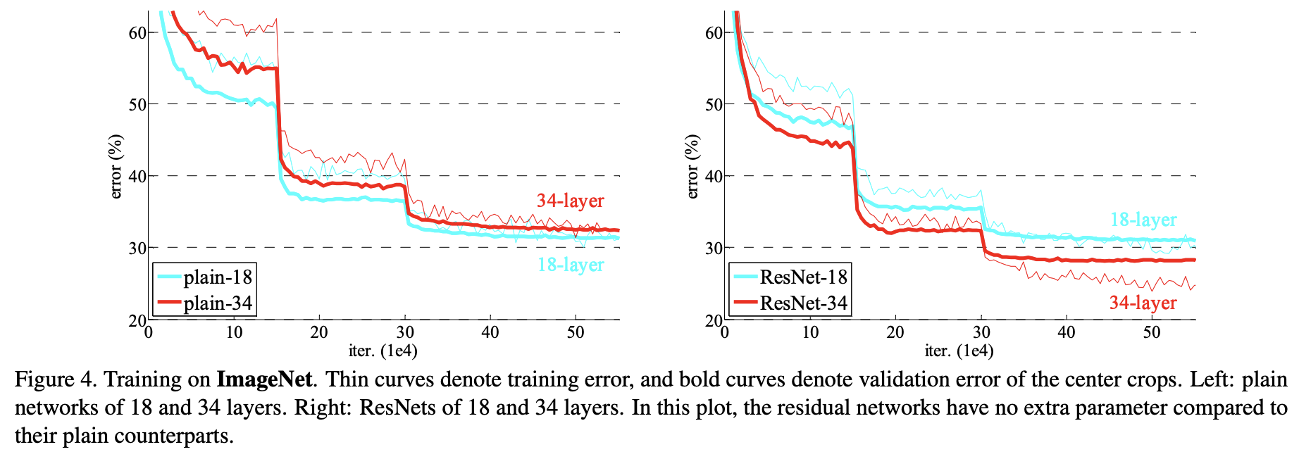 plain으로 학습했을 때는 34-layer가 18-layer보다 깊은데도 에러율이 더 높았다.