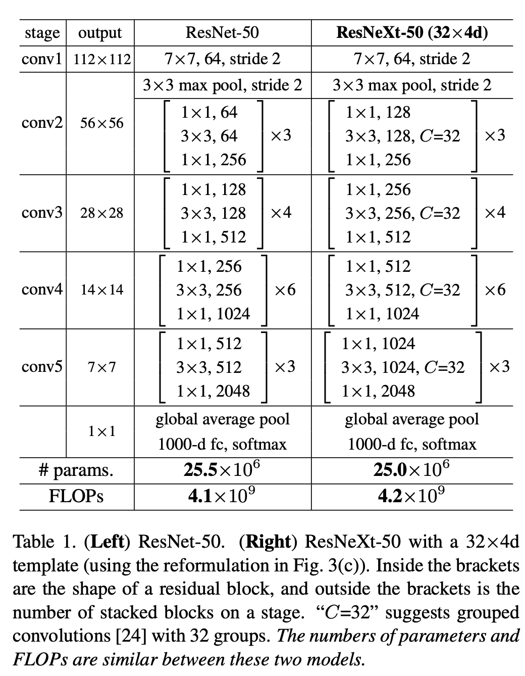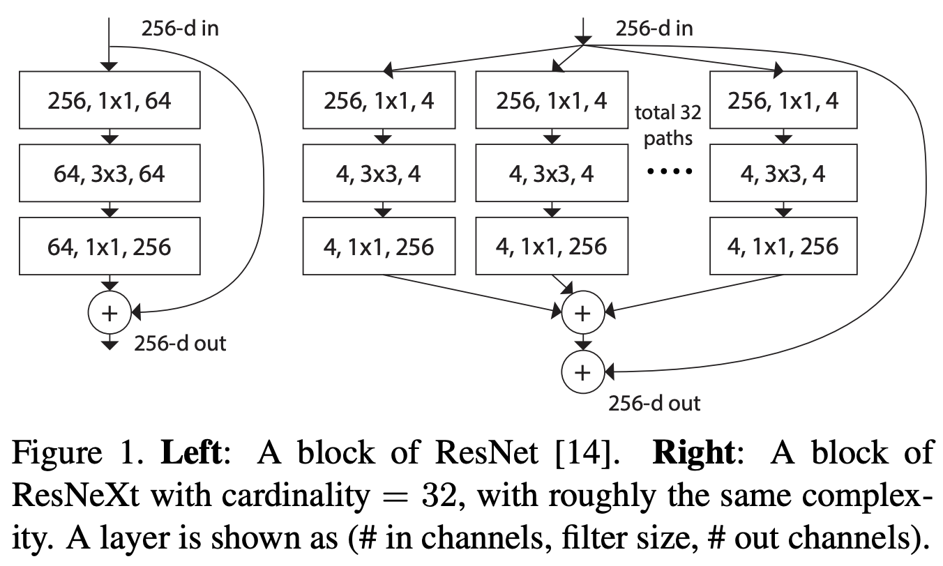 아래와 같이 ResNext-50을 구성하고, ResNet-50 과 매우 비슷하다.