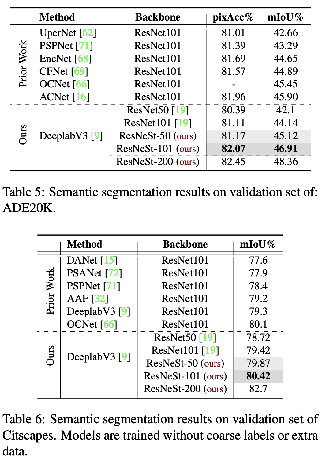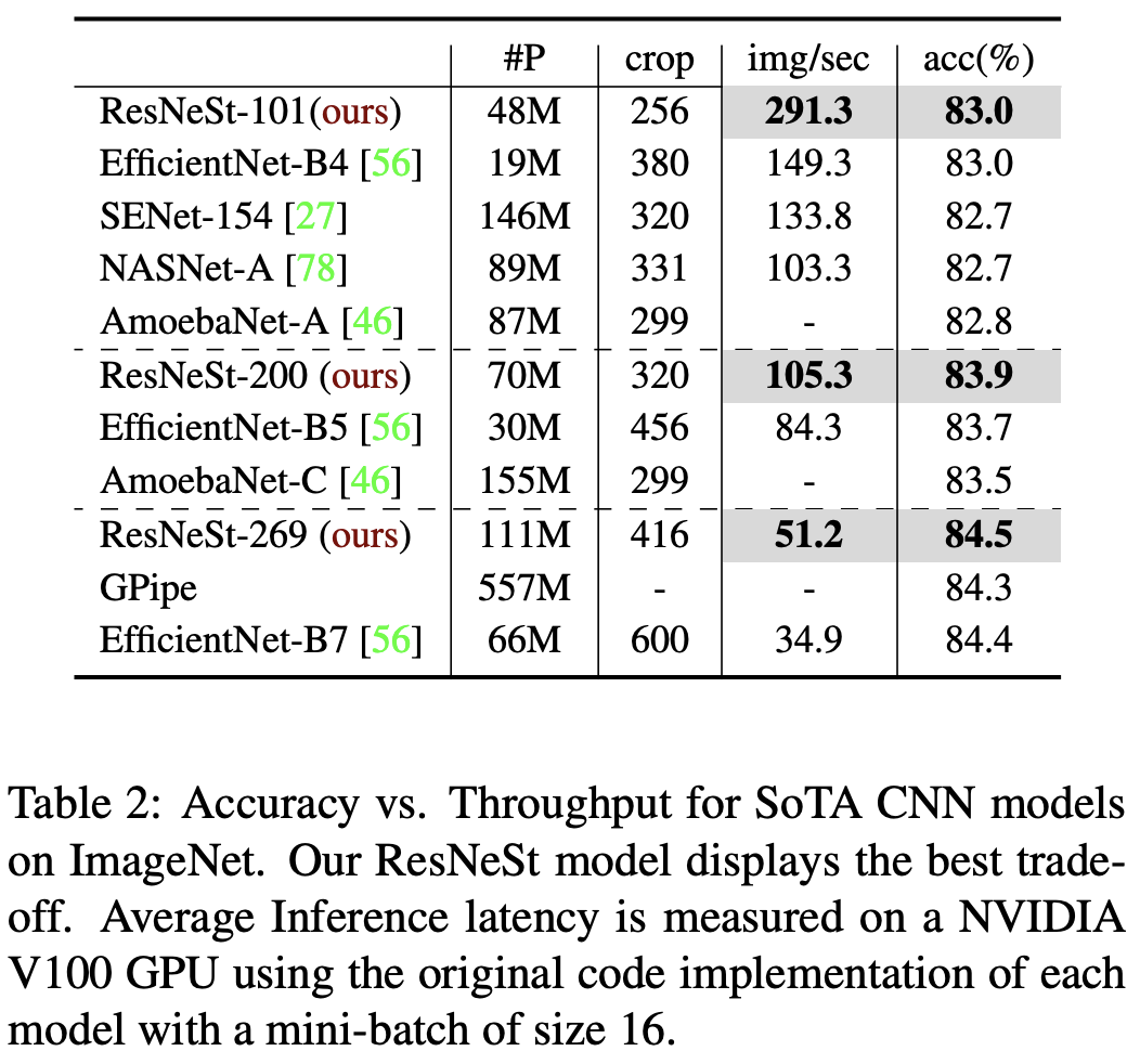 ResNet-101, ResNeXt 와 같은 다른 모델의 101보다 resnest 50이 더 성능이 좋다.