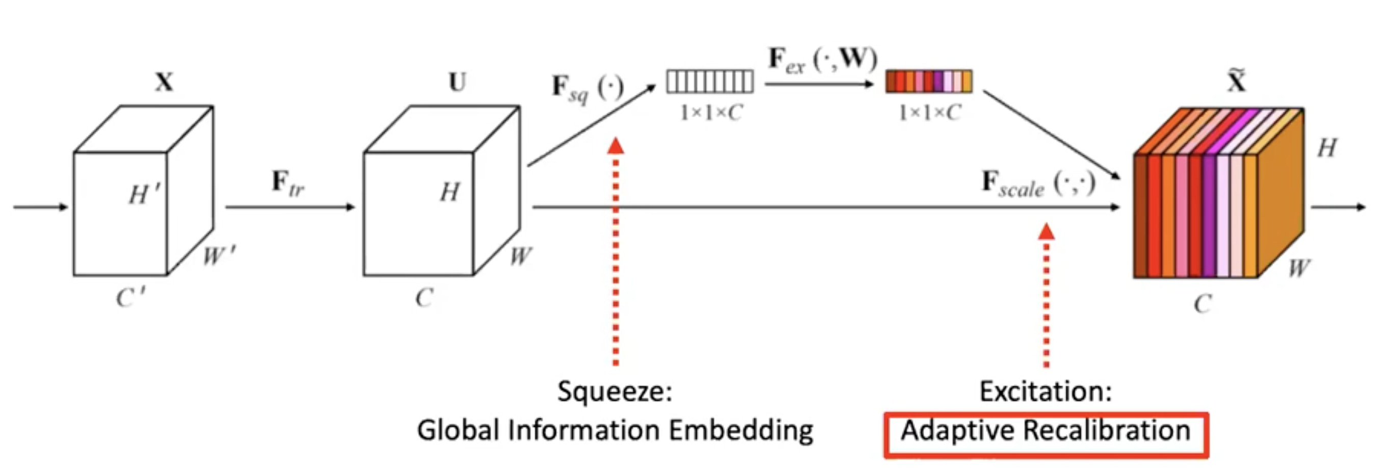 fully-connected layer 몇 개로 attention weight를 계산하는 네트워크를 삽입하여, 각 채널에 대한 가중치 weight를 만든다.
