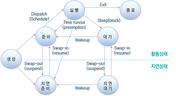 - 프로세스는 시스템에 등록된 후에, 여러 가지 상태를 거치면서 작업을 수행한다.
