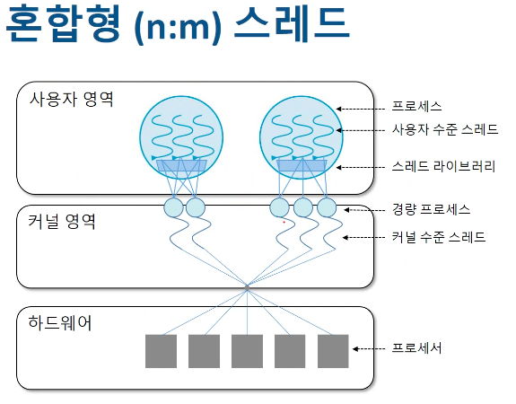 n개 사용자 수준 thread - m개의 커널 thread (n > m)